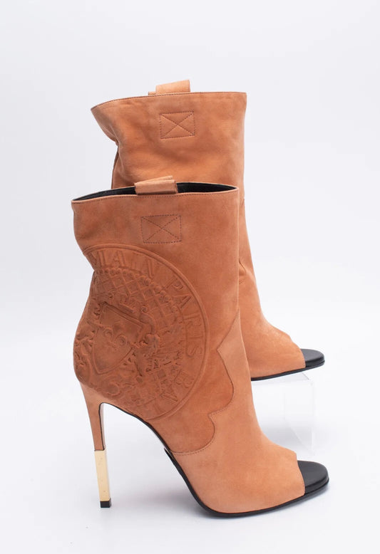 $1050 BALMAIN Leather Ankle Boots US7 UK4 EU37 Blazon Logo Heel Made in Italy